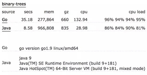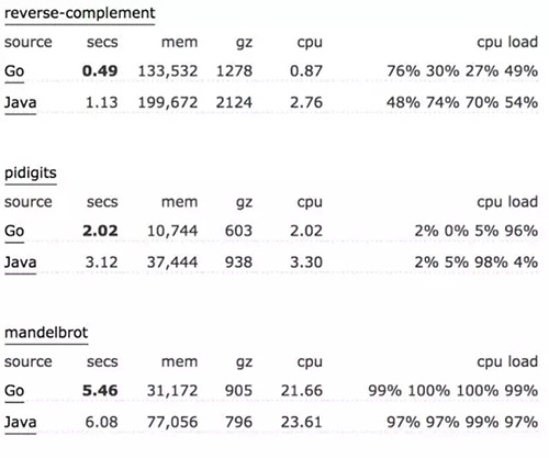 Go 极其地快。其性能与 Java 或 C++相似。在我们的使用中,Go 一般比 Python 要快 30 倍。以下是 Go 与 Java 之间的基准比较: