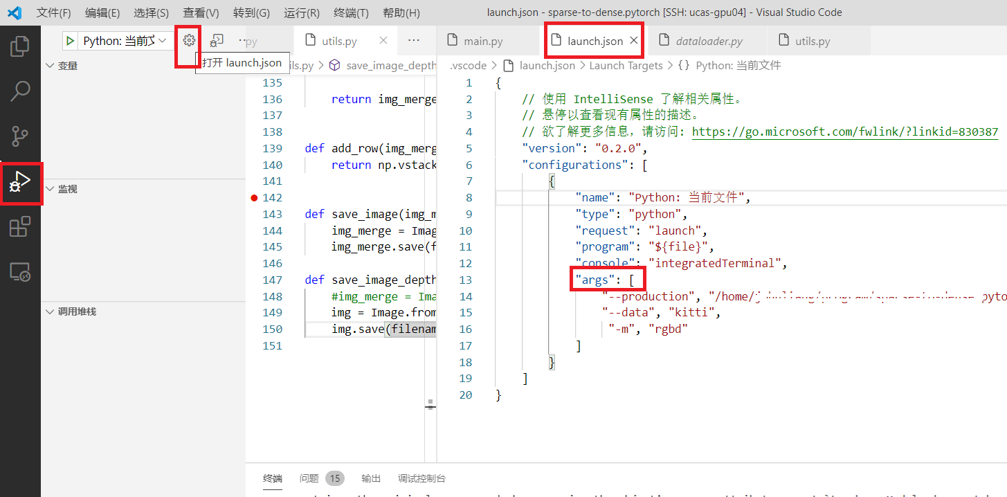 - 3 在launch.json文件中的 configrations 项中添加 “args” 命令行参数,如下图所示。