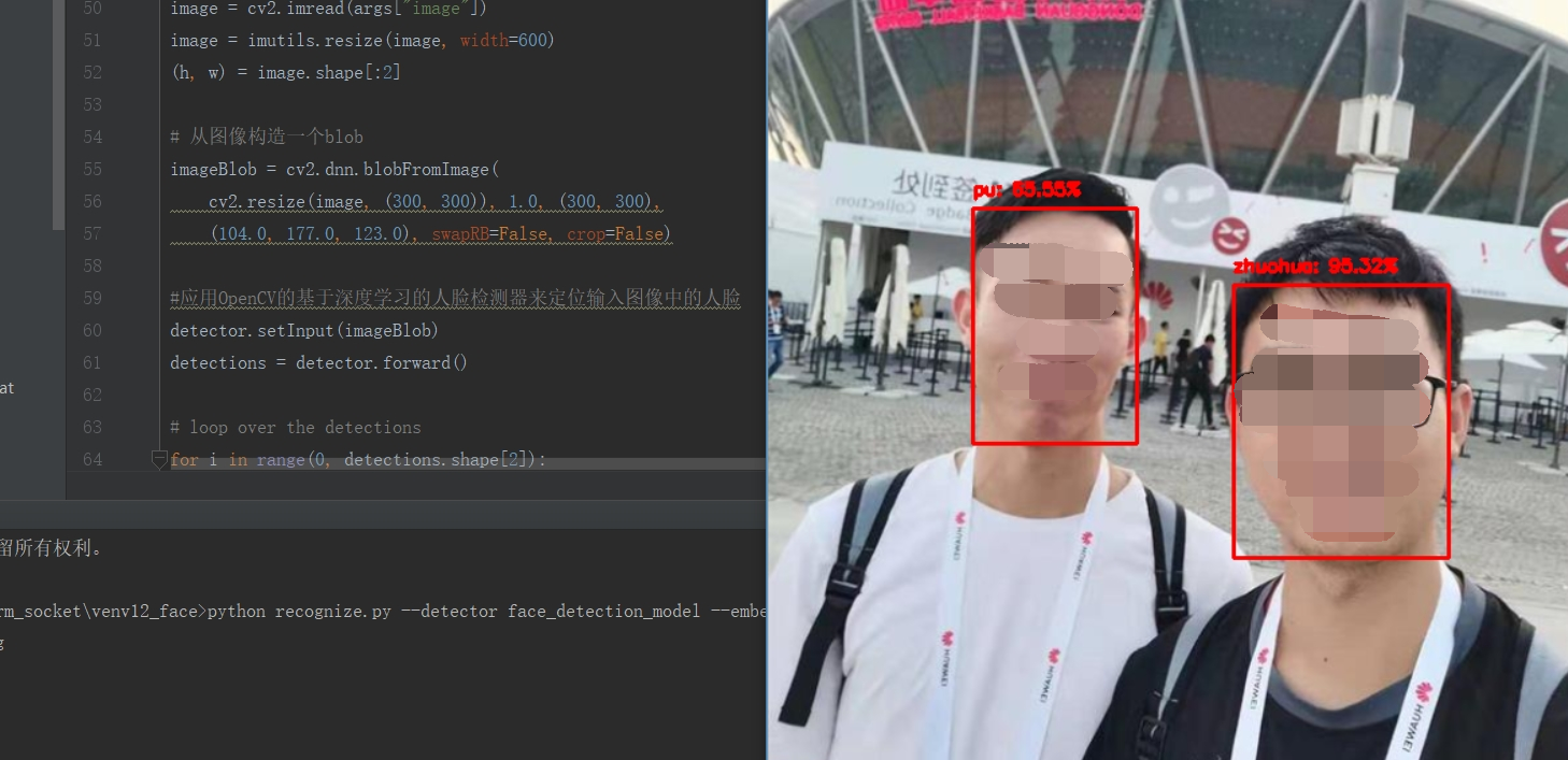 首先,我们构造一个faceBlob (来自 面部 ROI)并将其传递 给 嵌入器 以生成描述面部的128-D向量(第80-83行)