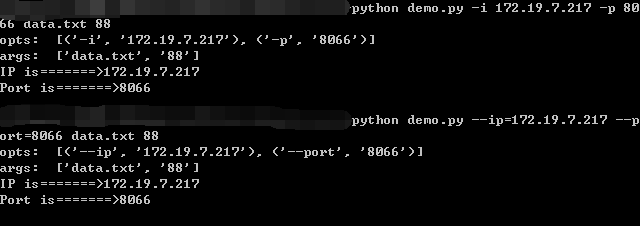 接下来我们使用getopt模块来进行参数命令行的解析操作,代码中我们选用IP和端口两个属性作为待传入的参数,具体实践如下: