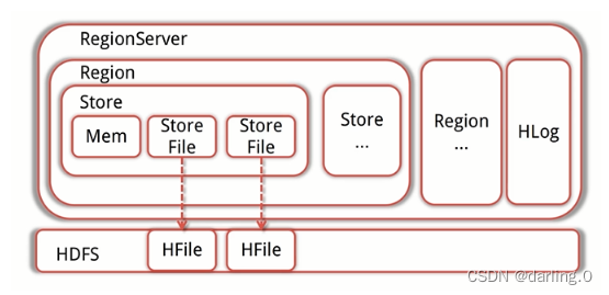 Region是hbase存储数据的基本单元,数据都存储在Region中,每一个Region只存储一个columnFamily(列族)的数据,而且只是这个列族的一部分,当Region的大小达到某个阈值之后,会根据rowkey的排序,划分为多个Region,每个Region中包含多个Store对象,每个Store对象包含一个memStore和一个或多个Store File,memStore是数据在内存的实体,并且一般是有序的,当有数据写入的时候,回先写入到memStore中,当memStore的大小达到上限之后,Store会创建StoreFile,StoreFile便是Hfile的一层封装。