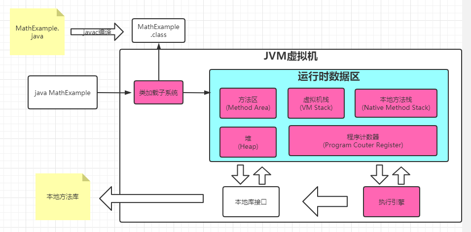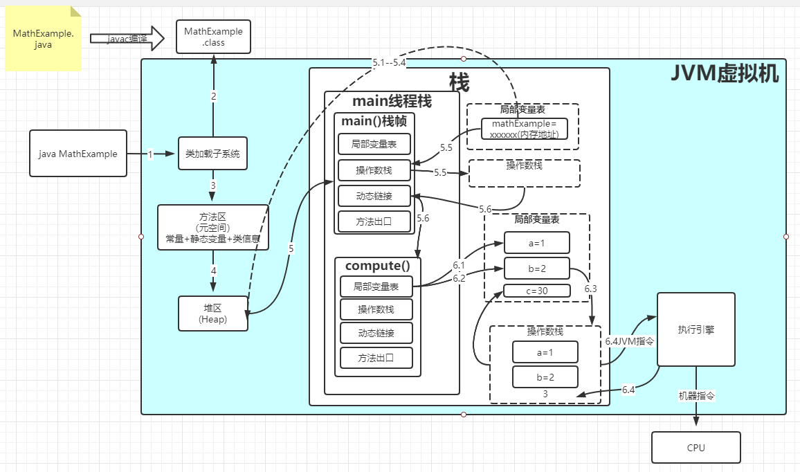 当我们执行java MathExample命令运行java程序时,JVM的"类加载子系统"会从classpath找到MathExample.class字节码,加载到"方法区(Method Area)",并且在"堆(Heap)"生成MathExample对象,接下来执行MathExample对象的main方法。详细的"类加载"过程,参考文章:类的生命周期。