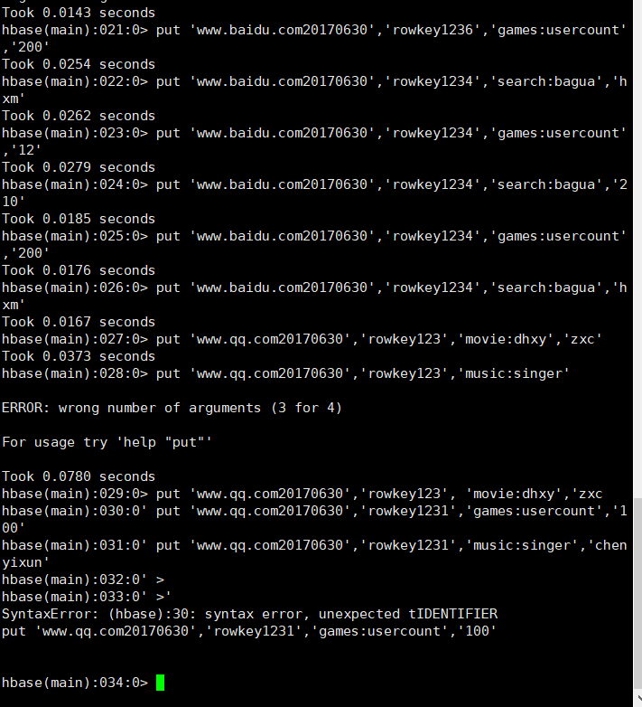 put 'www.baidu.com20170630','rowkey123','games:usercount','12' put 'www.baidu.com20170630','rowkey123','search:bagua','huang xiao ming' put 'www.baidu.com20170630','rowkey1236','games:usercount','200' put 'www.baidu.com20170630','rowkey1234','search:bagua','hxm' put 'www.baidu.com20170630','rowkey1234','games:usercount','12' put 'www.baidu.com20170630','rowkey1234','search:bagua','210' put 'www.baidu.com20170630','rowkey1234','games:usercount','200' put 'www.baidu.com20170630','rowkey1234','search:bagua','hxm' put 'www.qq.com20170630','rowkey123','movie:dhxy','zxc' put 'www.qq.com20170630','rowkey123','music:singer','xiaolei' put 'www.qq.com20170630','rowkey123', 'movie:dhxy','zxc' put 'www.qq.com20170630','rowkey1231','games:usercount','100' put 'www.qq.com20170630','rowkey1231','music:singer','chenyixun'