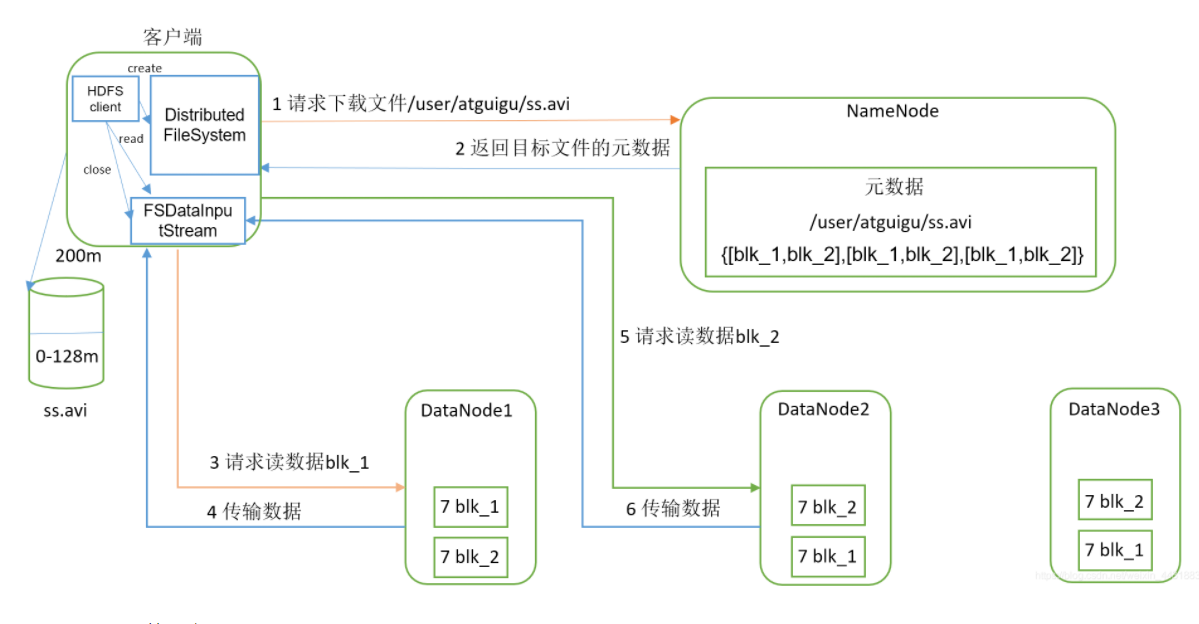 - 客户端向namenode请求下载文件,namenode通过查询元数据,找到文件块所在的datanode
