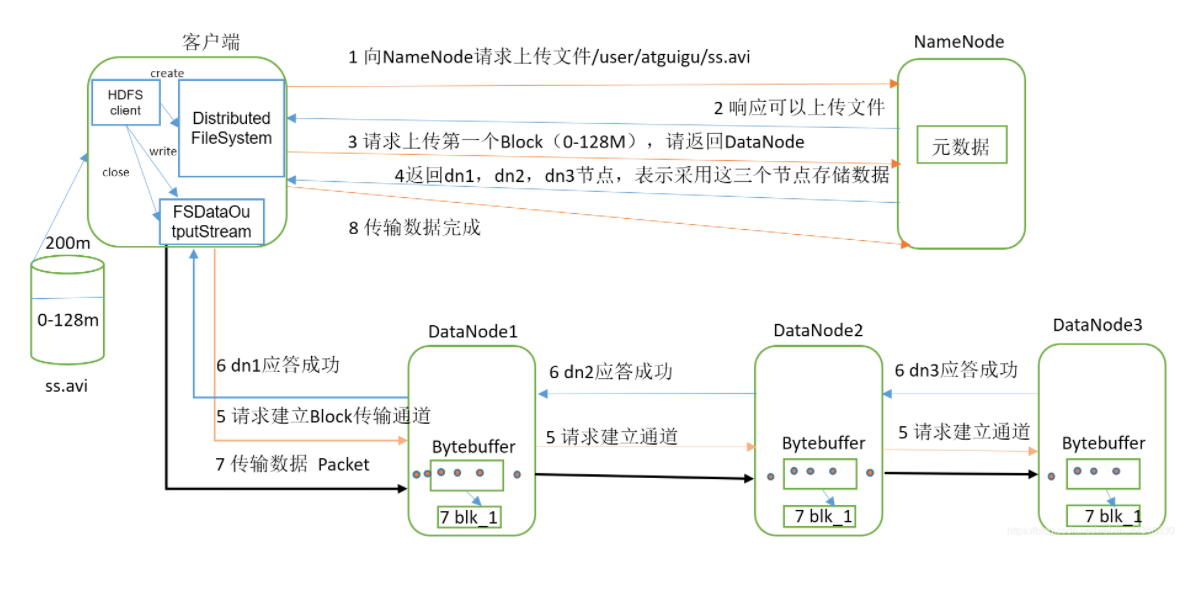 - 客户端请求dn1上传数据,dn1收到请求会继续调用dn2、dn3,将这个通道建立完成