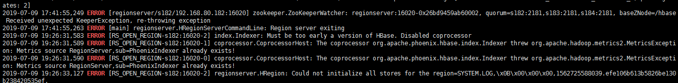 问题二出现后,发现hbase下,多了phoenix的几个系统表,并且regionserver出现闪退的情况,regionserver错误日志如下: