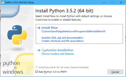 3、安装刚才已经下载下来的安装包, 安装过程下图所示,使用默认配置,选择“Install Now”,勾选下面的Add Python3.5 to PATH,然后就是一直next,直到完成。