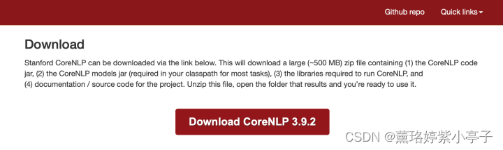 1. 首先需要去Corenlp的官网下载对应的包,本文使用的是stanford-corenlp-full-2018-10-05。需要进入CoreNLP官网的下载页点击Download CoreNLP 3.9.2 (对应stanford-corenlp-full-2018-10-05)来下载CoreNLP软件。