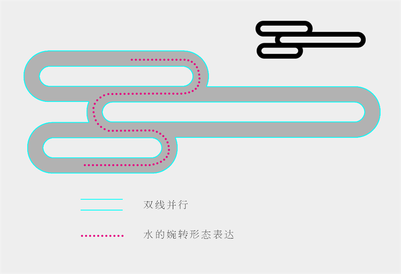 水的部分我们需要更多对于锚点的控制技巧,这里曝露一下思考过程:我们想要表现水的回旋流荡之美,可以采用圆角矩形的圆角部分来表现,这样左右蜿蜒就能作出水的效果。但如果用单线来表现水波显然有点单薄,为了丰富一下,我们决定利用双线条并行的方式,但这样就造成了绘制上的困难。可并不是没有解决方案,如果采用较粗的线条来绘制单线,将绘制成功的路径进行扩展,扩展后将填充关闭,只留下描边,这样就会达成我们的预期的双线并行的效果。