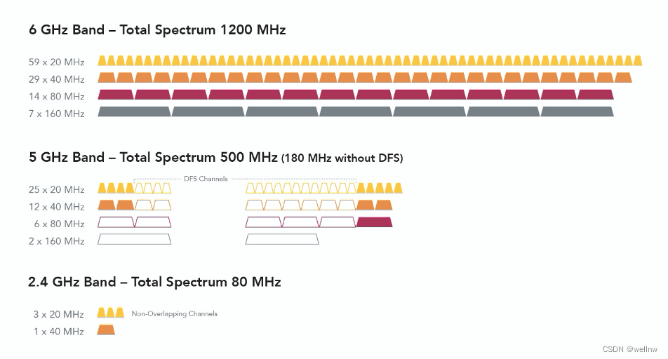 从上图可知,Wi-Fi 在 2.4 GHz 频段只有 80 MHz 的频谱,在 5 GHz 频段只有 500 MHz。在这 500 MHz 中,动态频率选择 (DFS) 信道通常不可用或未部署。 由于可用的信道如此之少,所有信道最终都会出现拥塞,太多的接入点 (AP) 和客户端共享同一信道。 受限的 DFS 通道留下了非常有限的连续频谱。这使得很难找到或启用 80 MHz 或 160 MHz 信道,但只有通过这些宽信道才能实现最高的 Wi-Fi 数据速度。这意味着即使设备的数据表可以说是多千兆的速度,但在大多数地方几乎不可能达到这种速度。 WiFi 6E的出现,凭借 59 个 20-MHz 信道,将立即消除拥塞问题。由于连续频谱和 14 个 80-MHz 信道或 7 160-MHz 信道可供选择,用户将能够找到一个没有拥塞的可用信道。这使该技术能够提供最高速度。