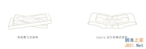 为了薄,苹果公司为新MacBook设计了一种全 新的“蝶式键盘”,键帽下的支架并非常见的火山形或X形(俗称剪刀式),而是一种V字形状,看起来像一只展开的蝴蝶翅膀。这种全新蝶式支架结构带有不锈钢穹顶形开关,比剪刀式结构薄了40%,单位面积也比剪刀结构更宽,显而易见的结果是新MacBook的键帽面积更大,比之前的Mac键盘增加了17%,同时,因为在有限的空间内提升了按键面积,也会导致按键之间的空隙更小,为了降低误按率,苹果采用的办法是加大每个按键的弧度,综合这一切的结果就是,每个新MacBook的键盘字粒看起都比以往大了一圈,更密集,距离边框更近(这也让新MacBook的机身看起来更小)。