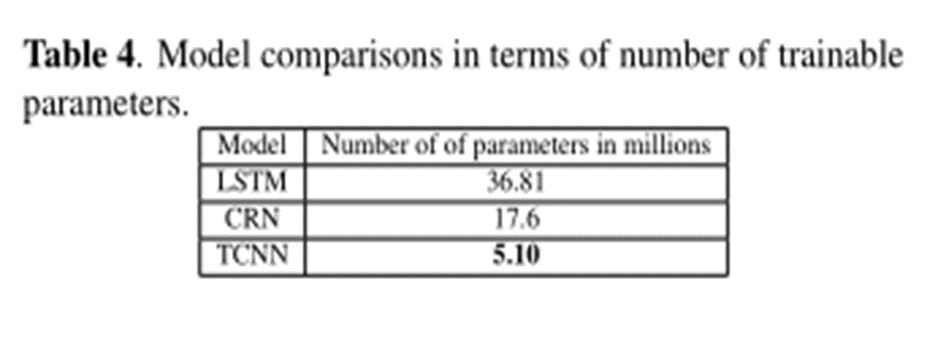除了在这种情况下,TCNN 在 PESQ 分数方面也显着优于 CRN,在性能改进中也观察到了类似的趋势。这表明 CRN 模型过拟合训练集中的说话者。还比较了模型中可训练参数的数量。数字在下表中给出。与基线模型相比,所提出的模型具有更少的参数,使其适合在实际应用中的有效实现。