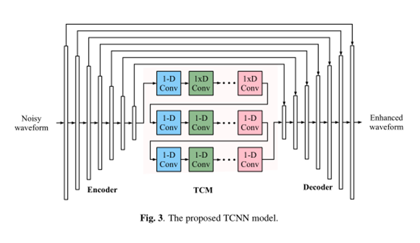 受成功实现用于序列建模的 TCNN 以及基于编解码器架构的时域语音增强的有效性的启发,建议将它们结合起来以获得实时增强系统。所提出的模型具有基于编码器-解码器的架构,该架构由因果卷积层组成。在编码器和解码器之间插入一个 TCM,以学习过去的长期依赖关系。