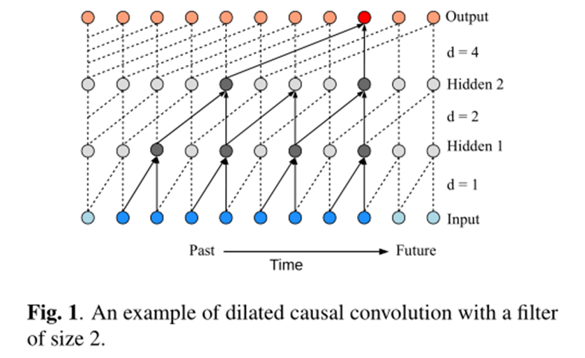 为了施加因果约束,TCNN 由因果卷积层和扩张卷积层组成。因果卷积确保信息不会从未来泄漏到过去。扩张的卷积有助于增加receptive field。receptive field越大,网络越能回顾过去。下说明了使用大小为 2 的滤波器的扩张和因果卷积的示例。