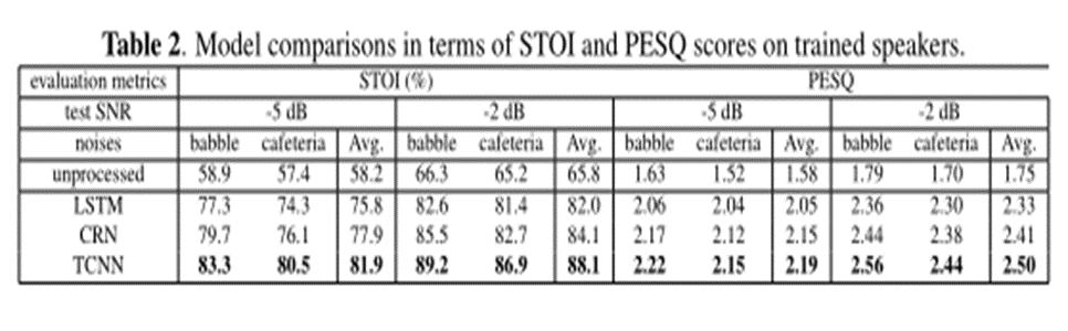 在STOI和PESQ分数方面比较模型。首先,将 TCNN 与受过训练的说话者的基线进行比较。结果在下表给出