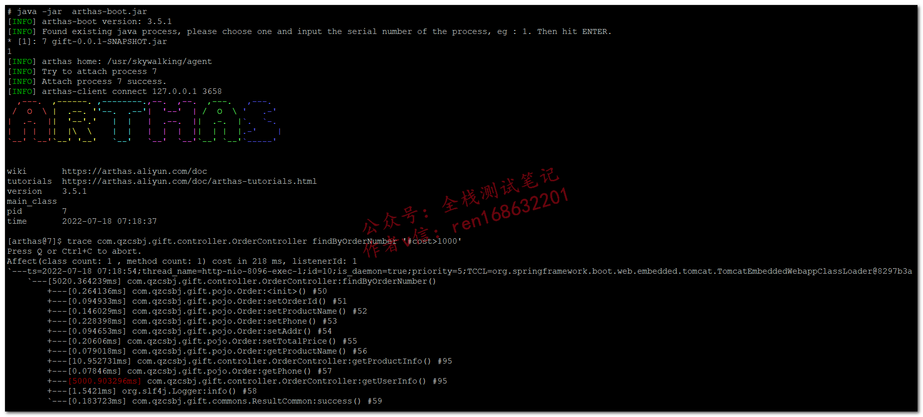 [arthas@6]$ trace com.qzcsbj.gift.controller.OrderController findByOrderNumber '#cost>1000'