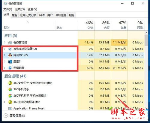 2、从打开的“任务管理器”界面中,切换到“进程”选项卡,将不再使用的应用程序进程选中,并点击“结束任务”按钮以中止对应的应用程序的运行;