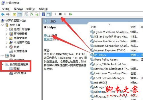 6、从打开的“计算机管理”界面中,展开“服务和应用程序”-“服务”选项卡,找到“ip helper”服务项并将其“停用”;