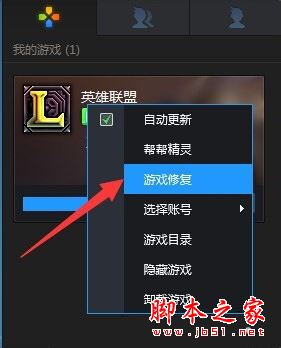 就是通过“LOL助手”来修复游戏环境,下载并安装“LOL助手”并完成英雄联盟游戏的添加操作后,点击“LOL英雄联盟”图标右上角的“下拉菜单”按钮,并从其列表中选择“LOL修复”项进入;