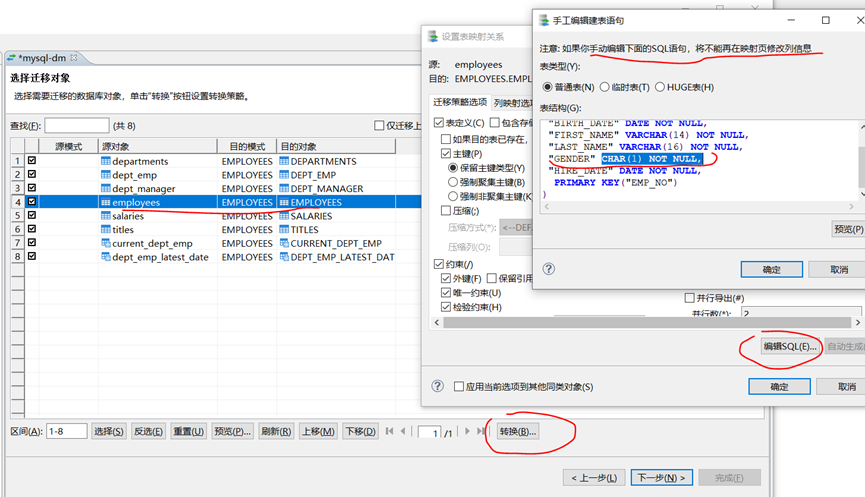 注意:这里要编辑一下salaries、titles表,让它们迁移后继续成为分区表。