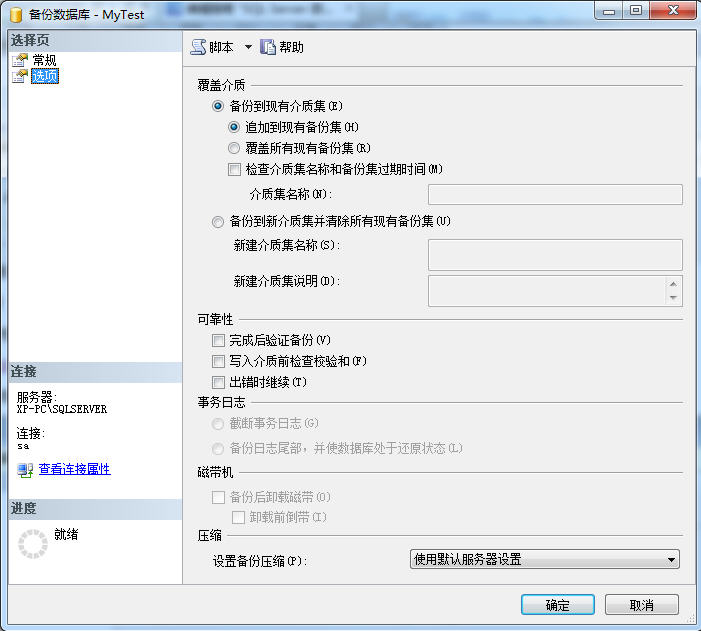 如果要将数据库备份到磁盘上,那么选择磁盘后(可以选择一个或多个磁盘驱动器,也可选择磁带机设备,在此以磁盘驱动器为例),如果保持默认【备份到现有介质集-追加到现有备份集】SQL Server将自动创建一个介质集(备份介质(磁盘文件或磁带)的每个卷都包含介质标头,介质标头是在第一次使用磁带(或磁盘)执行备份操作时创建的,它将包含介质的名称、介质集的唯一标识号、介质簇的唯一标识号等等),然后再将备份集添加到介质集中。例如上篇文章中首次完整备份,SQL Server将自动创建一个介质集,并将备份集添加到介质集中,接着再备份事务日志文件,此事务日志文件备份集将被追加到现有备份集,最终备份文件我们看到的只是一个备份文件MyTest.bak,但还原时选择此文件后,要还原的备份集列表将显示先后备份的备份集,如完整备份集、第一次事务日志备份集、第二次事务日志备份集等。