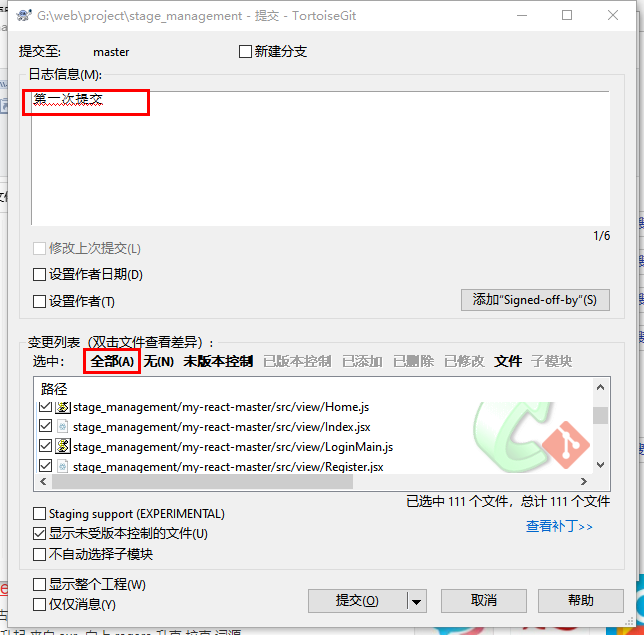 提交到本地仓库,git需要先将项目文件提交到本地仓库: