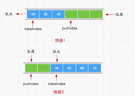 - 数据存储容器不同,ArrayBlockingQueue采用的是数组作为数据存储容器,而LinkedBlockingQueue采用的则是以Node节点作为连接对象的链表。