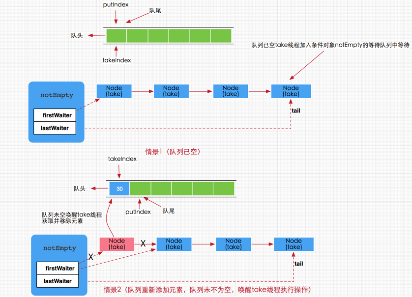 - 如果队列没有数据就挂起当前线程到 notEmpty条件对象的等待队列中一直等待,如果有数据就删除节点并返回数据项,同时唤醒后续消费线程