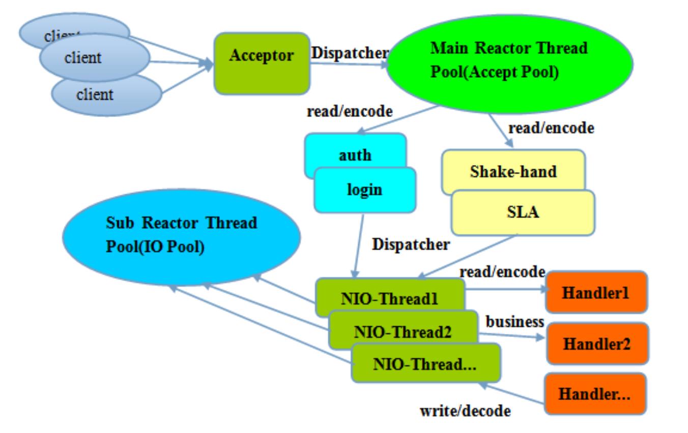认证,一旦链路建立成功,就将链路注册到后端 subReactor 线程池的 IO 线程上,由 IO 线程负