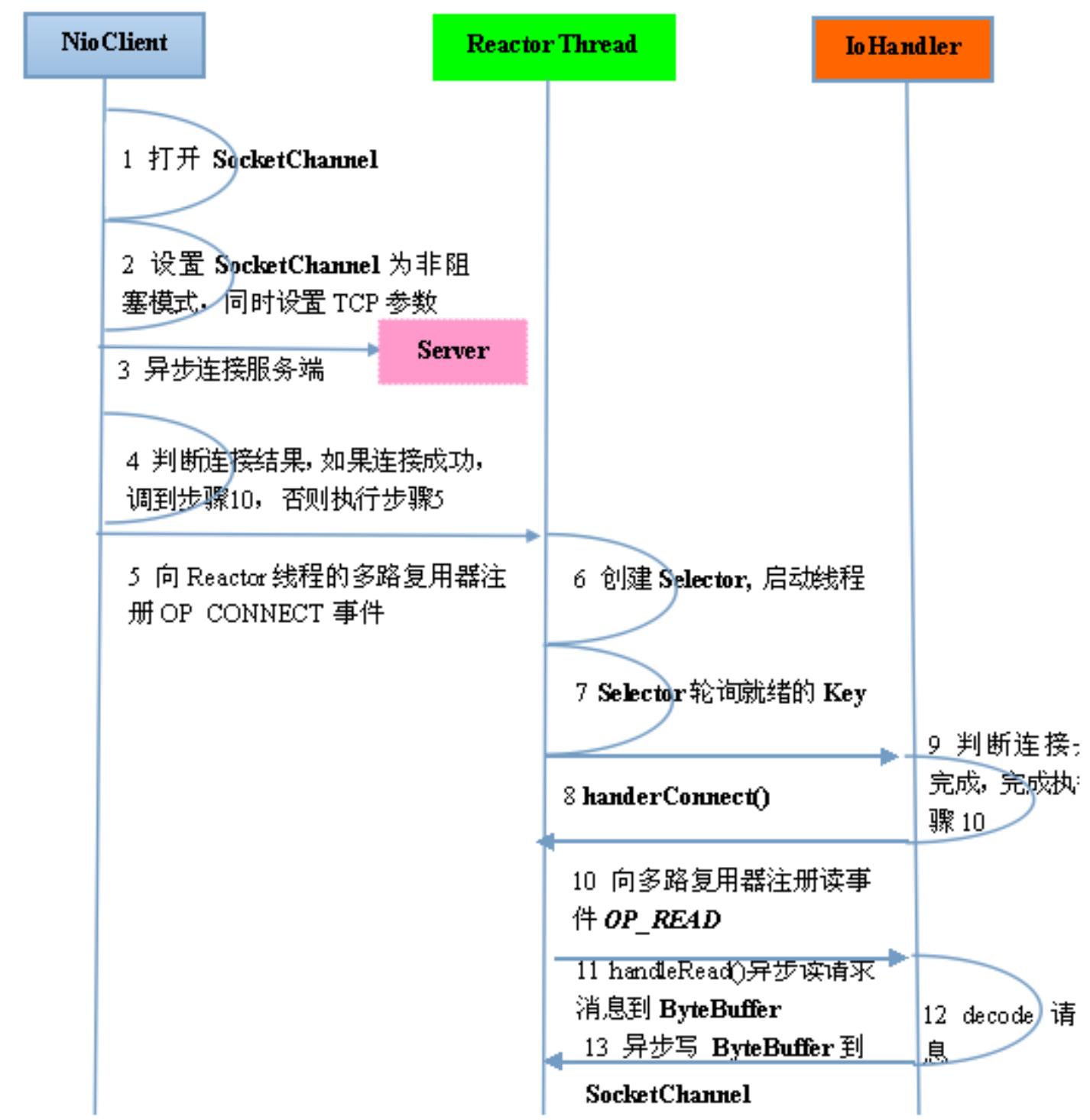 2) 作为 NIO 客户端,向服务端发起 TCP 连接;