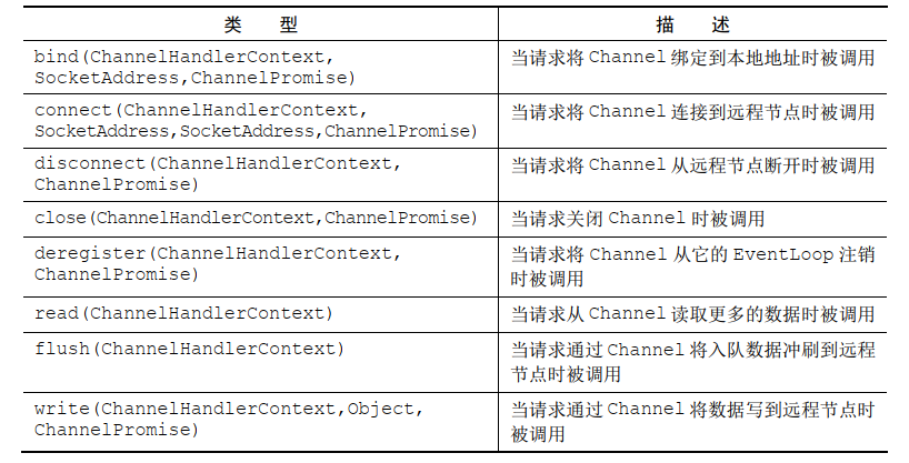 出站操作和数据将由ChannelOutboundHandler处理。它的方法将被Channel、ChannelPipLine以及ChannelHandlerContext调用。其强大功能就是可以按需推迟操作或者事件,使得可以通过复杂的方法处理请求。