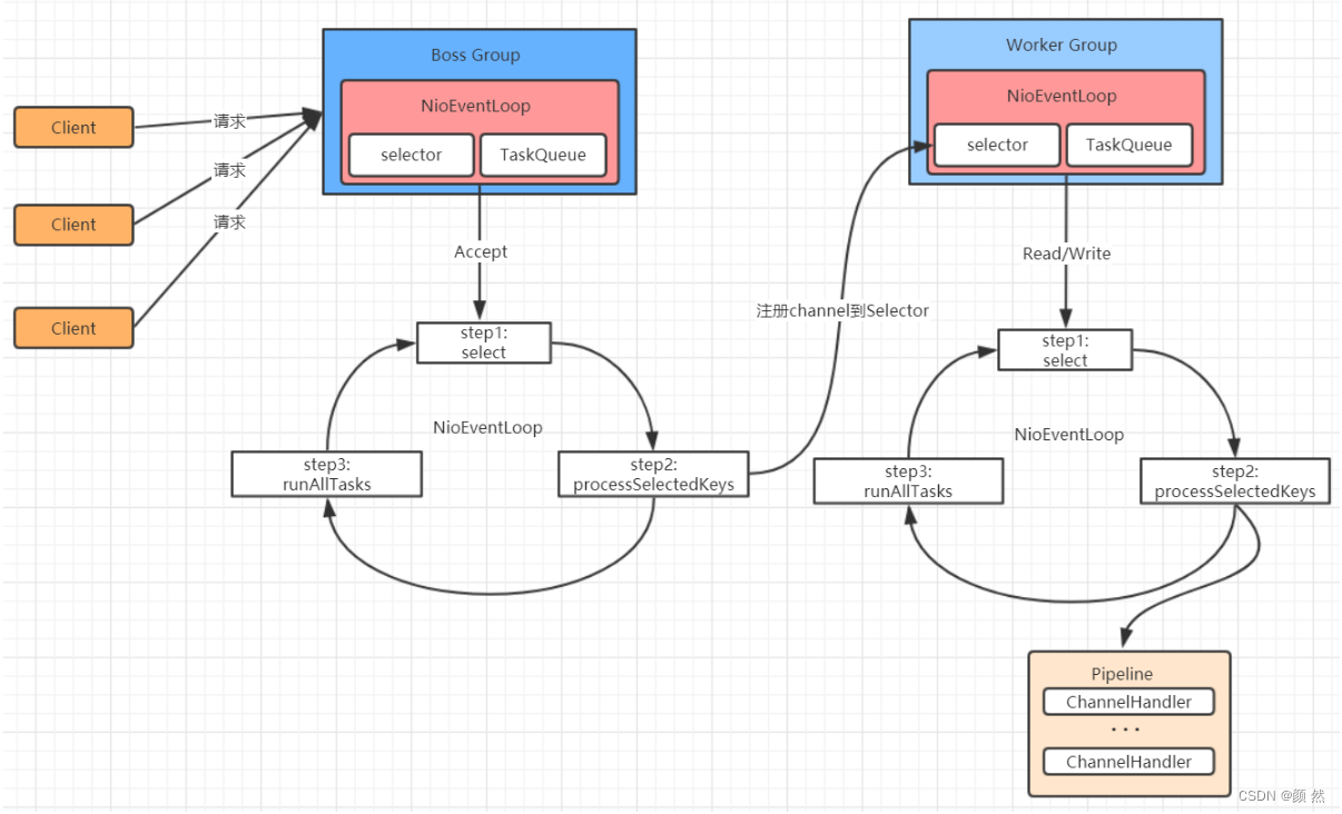 - 当接收到来自客户端的连接时,通过 ServerSocketChannel.accept ()获得对应的 SocketChannel,并封装成 NioSocketChannel 注册到 WorkerGroup 线程(类似于从 Reactor)中的Selector(每个 Selector 运行在一个线程中);