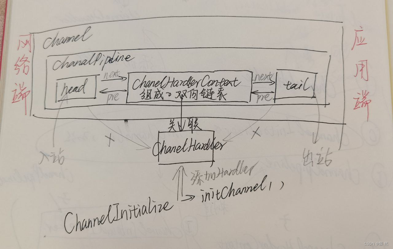 再看到链表的头和尾head和tail。head和tail并没有包含ChannelHandler,是因为他俩继承了AbstractChannelHandlerContext同时实现了ChannelHandler接口,所以它们有了Context和Handler双重属性。head靠近网络端,tail靠近应用端。入站时从head入,出站时从tail出。