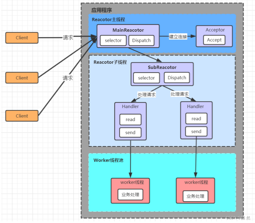 - Handler通过read从连接上读取请求数据,将请求发给 Worker 线程池进行业务处理
