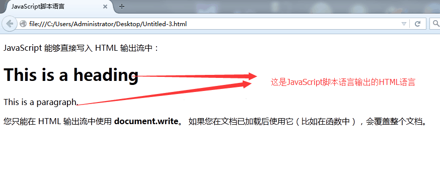 在本例中,JavaScript会在页面加载时向HTML的<body>写文本: