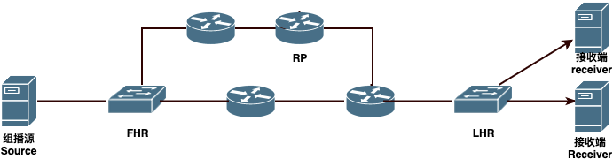 - LHR (Last Hop Router):如上图,配置了PIM的连接接收端的第一跳的路由器。