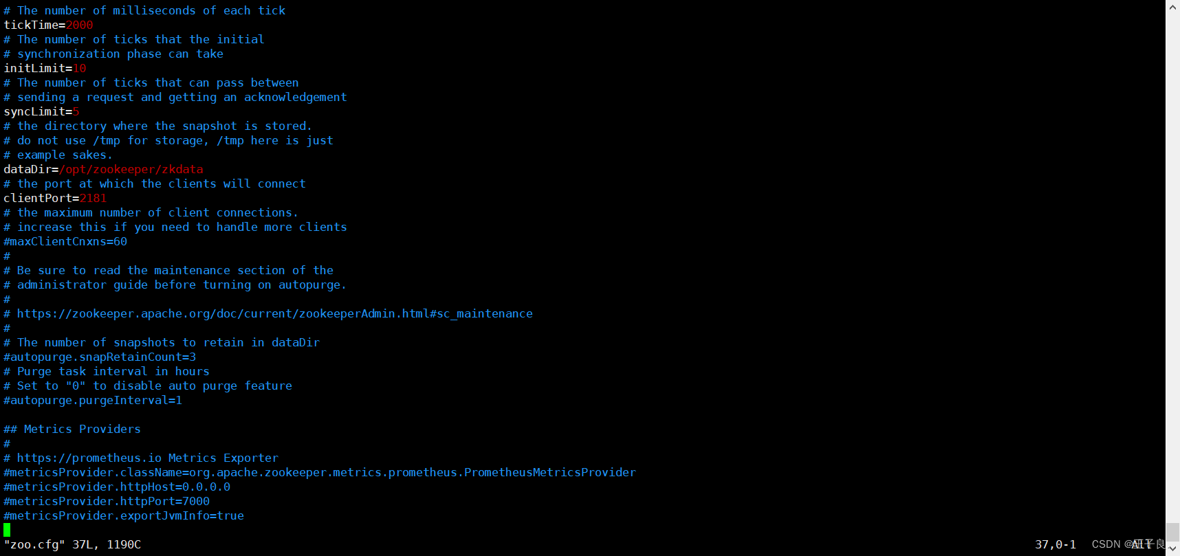 创建完成后,我们依然在zoo.cfg 文件中,我们按键盘上的 i 键,进行插入操作,我们把该位置更改为我们的 /opt/zookeeper/zkdata 即可。 然后我们按Esc, 输入 :wq 保存退出,至此完成。