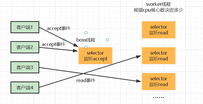 我们的boss线程只接受accept事件,worker线程关注客户端的读时间,达到分工合作。