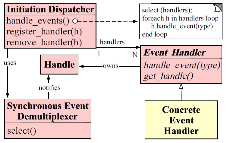 而其内部一般都有一个 Acceptor,用于通过对系统资源的操纵来获取资源句柄,然后交由 Reactor,通过 handle_events 方法派发至具体的 EventHandler 的。