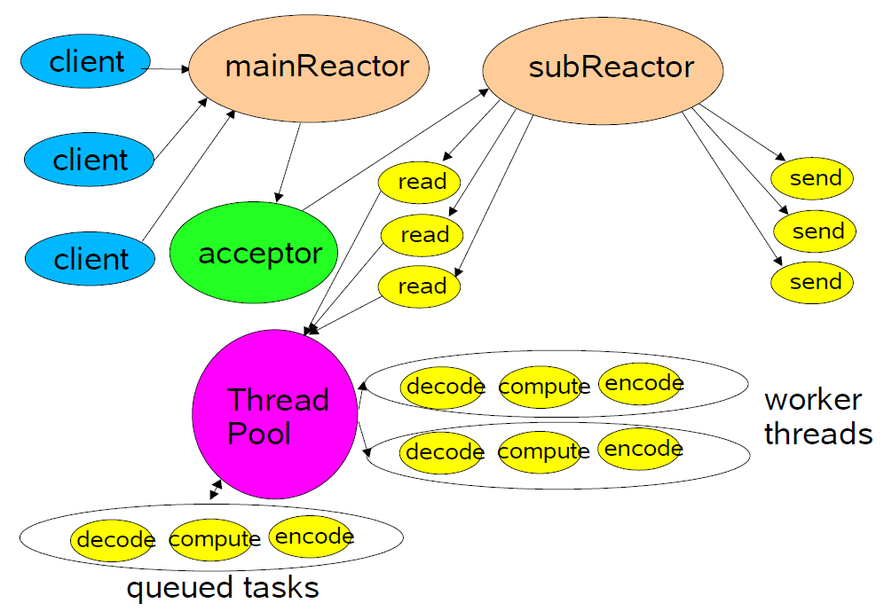 其中 mainReactor 主要进行客户端连接方面的处理,客户端 accept 后发送给 subReactor 进行后续处理处理。