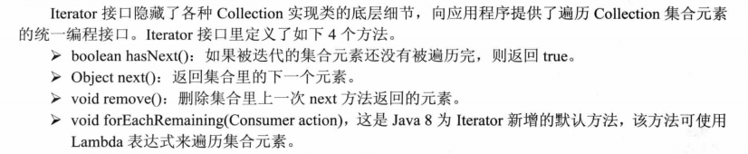 Iterator提供了两个方法来迭代访问Collection集合里的元素,并可通过remove()来删除集合中上一次next()方法返回的集合元素。