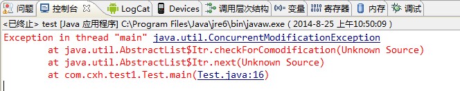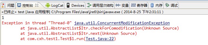 很显然,此时modCount为1,而expectedModCount为0,因此程序就抛出了ConcurrentModificationException异常。