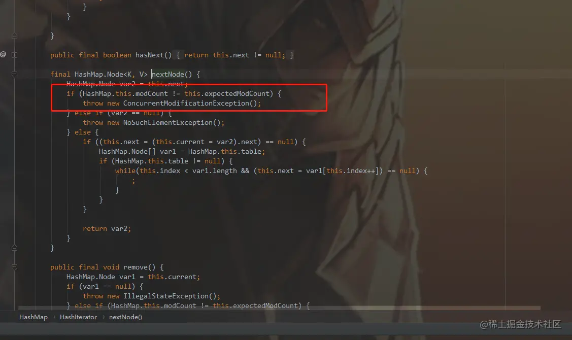 从报错中可以看出,HashMap$HashIterator.nextNode这个方法有代码错误了,点进去看,大概知道HashMap.this.modCount != this.expectedModCount 成立