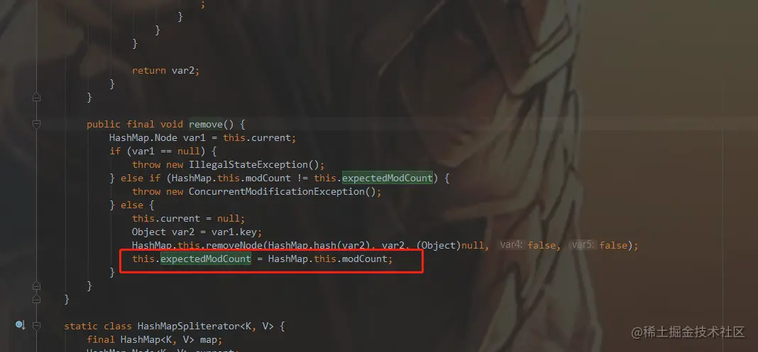 - 每次进行hashmap.remove操作的时候就会对modCount+1,此时迭代器里的expectedModCount还是之前的值。