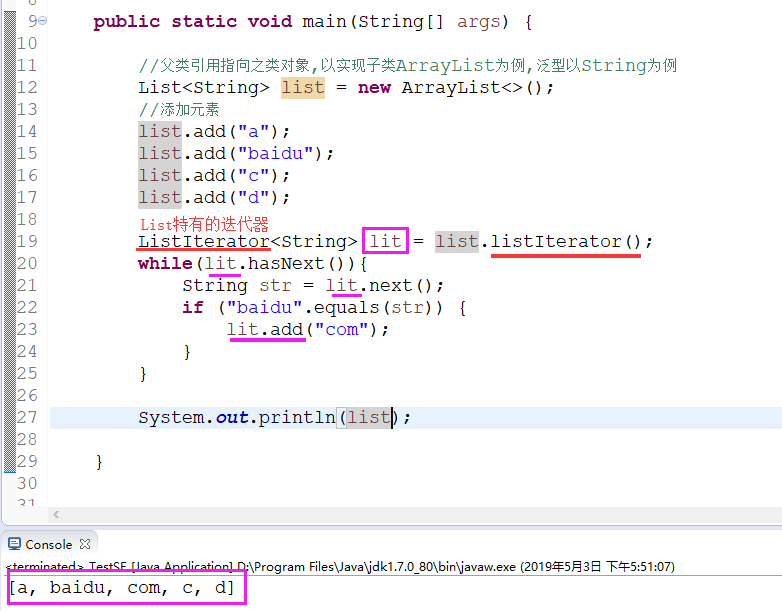 - 方案:迭代器遍历元素,迭代器修改元素(此处以List为例,每个集合都有自己的迭代器,List的特有迭代器ListIterator的特有功能add)