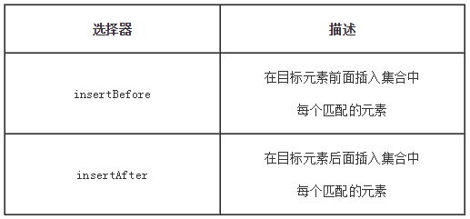 - 2个方法都是都可以接收HTML字符串,DOM 元素,元素数组,或者jQuery对象,用来插入到集合中每个匹配元素的前面或者后面