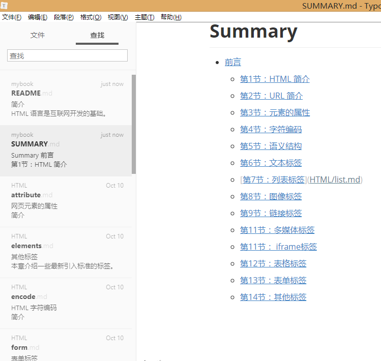 用 Typora 打开 SUMMARY.md,编辑如下(此步是编写书籍目录):