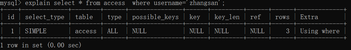 2.用执行计划看一下我的update语句发现并没有走索引(explain是不能用在update语句上的,这里我将where条件拿出来,用select执行)