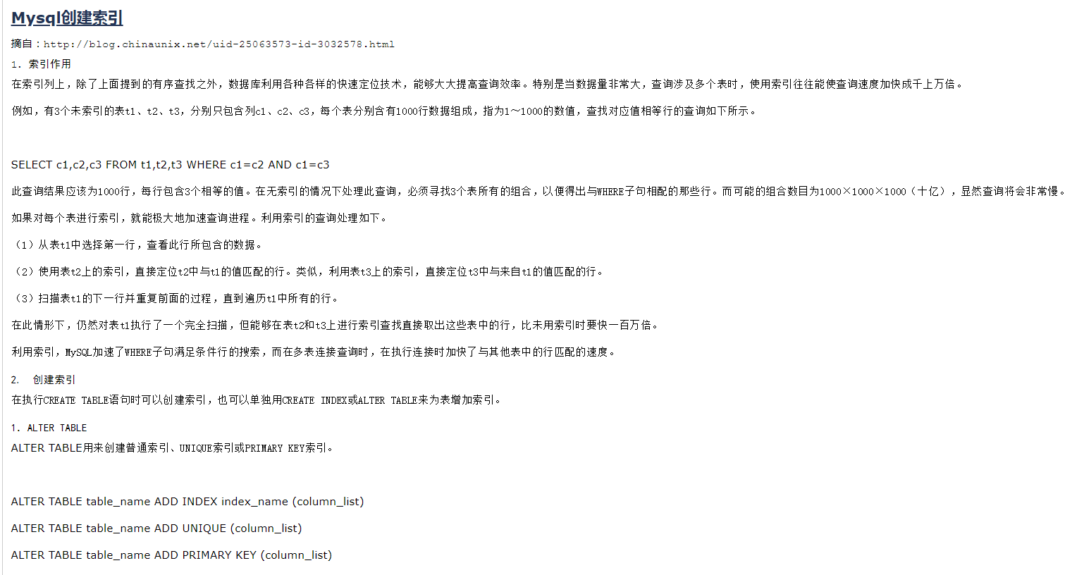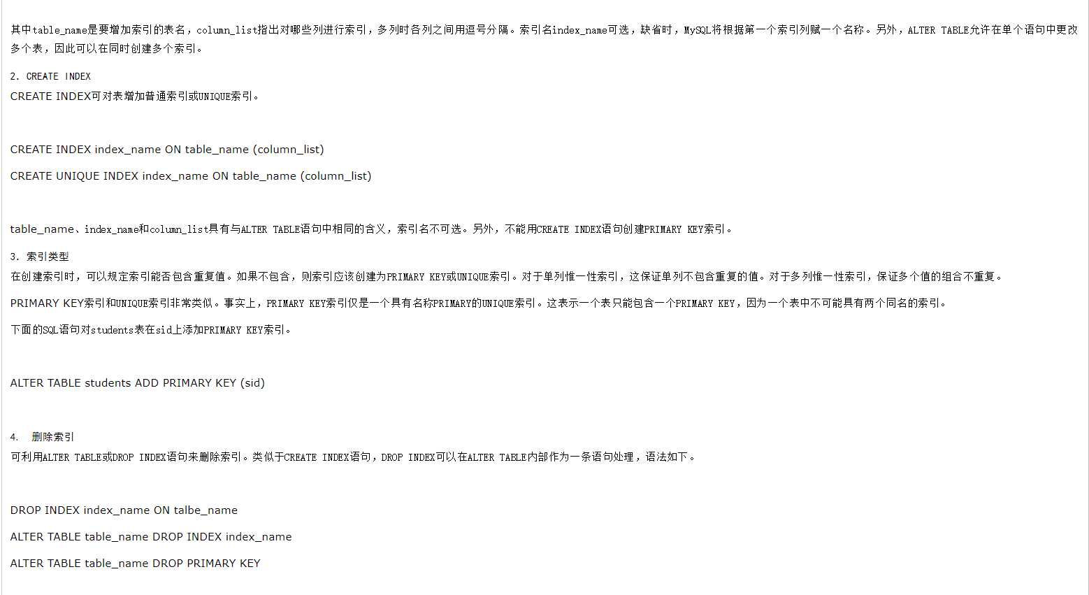 短索引(可以设置字段的长度size):ALTER TABLE 表名 ADD INDEX 索引名称 (一个或多个字段名(字段的长度size))