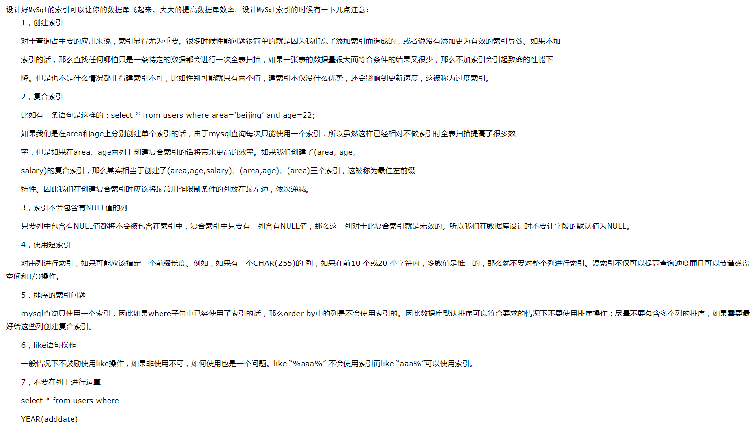 3.即使字段添加了索引,但是在SQL语句中使用了以下规则进行WHERE条件过滤的话,便不会使用上“字段中添加的索引”进行快速查询: